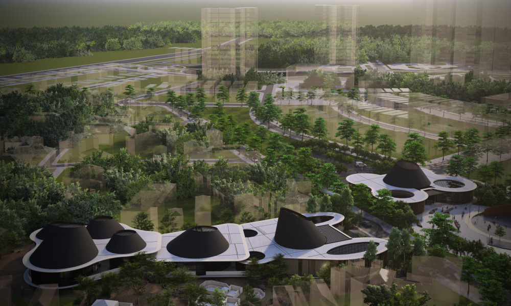 The pavilions are imagined as a series of village like groupings ,consisting a sequence of conical lantern roofs ,arranged to illuminate an excavated relic grouping.
