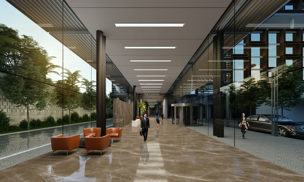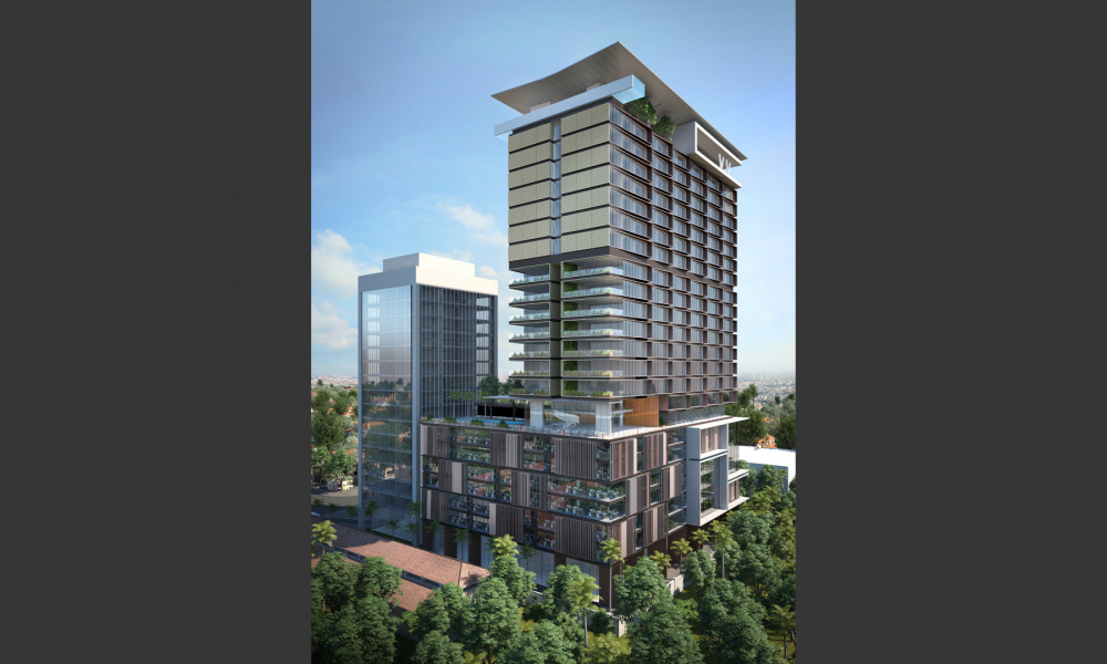 Linked by a shared drop off & lobby pavilion, the street front component is configured as Both a 4 storey F&B complex or as a 15 floor office tower.